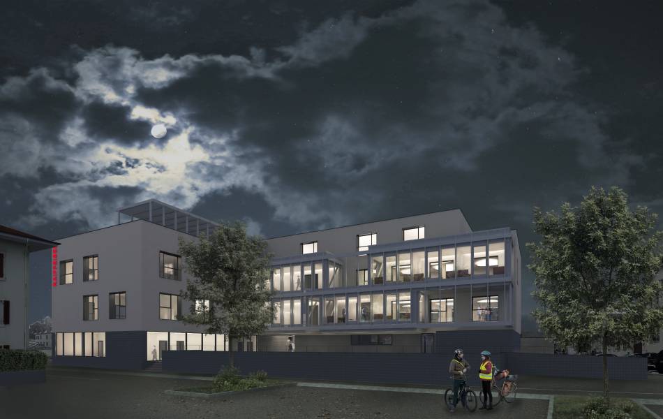En cours. Situé au centre de la Tour-de-Trême, cet immeuble commercial, administratif et de logement construit en 2011 abritait initialement 3 différentes sociétés et 2 appartements. L’une d’entre elles, la banque Raiffeisen Moléson, projeta d’investir la totalité des surfaces disponibles et de faire du site de la Tour-de-Trême son siège principal.