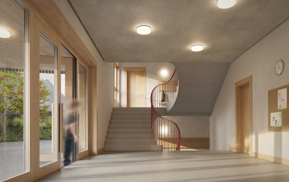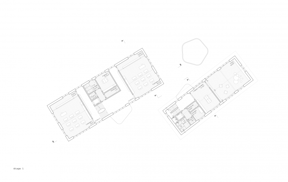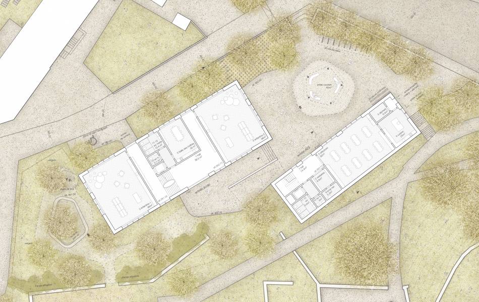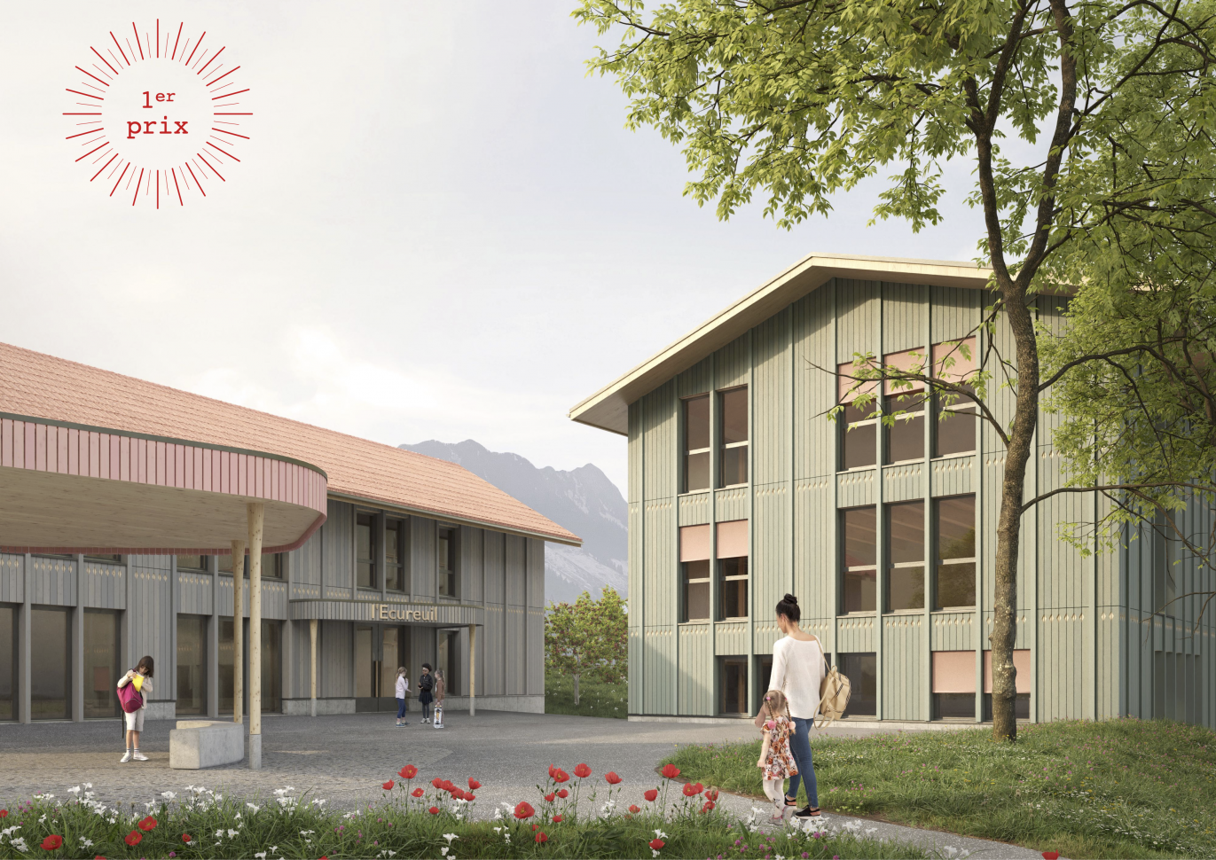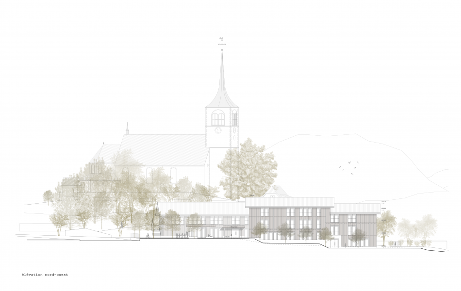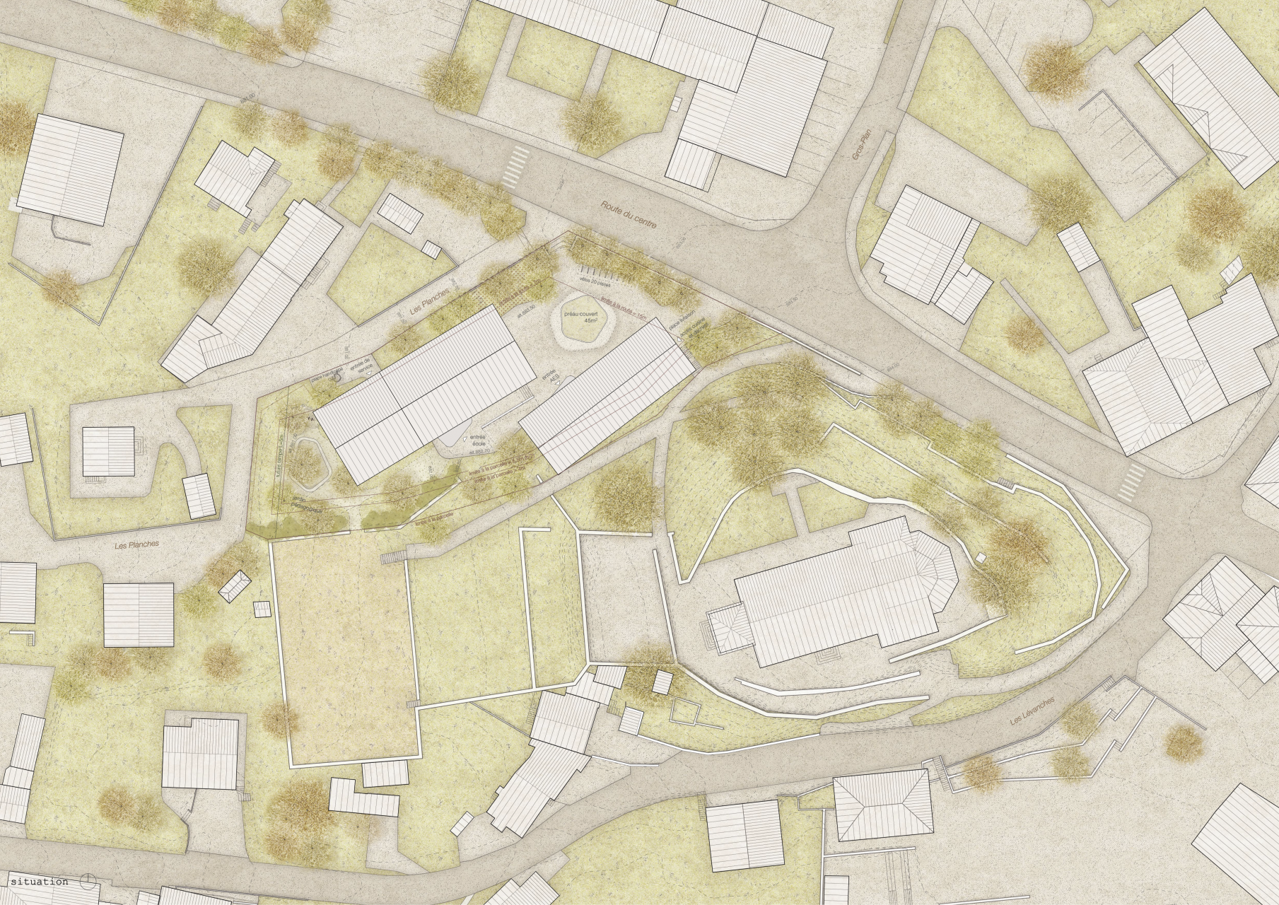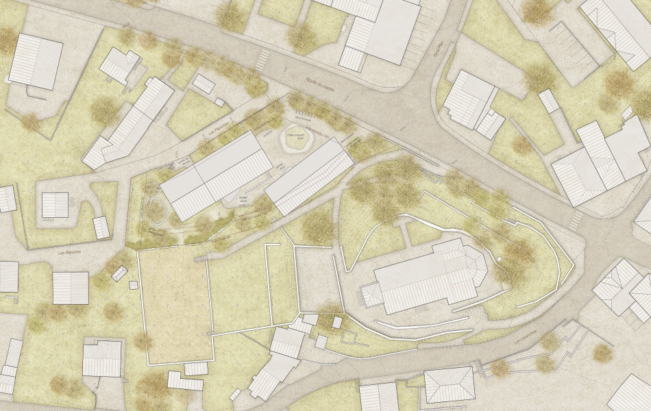 Le projet propose, par l’implantation de deux nouveaux bâtiments, de minimiser l’impact d’un programme important au pied de l’église. Le jeu des toitures, décalées et aux pentes différentes, procède de la même intention. Par leurs implantations en baïonnette, les deux nouveaux volumes créent au nord une cour haute où se situe l’accès principal au site, et au sud une cour basse, plus récréative et ludique. Les pleins et les vides se lisent selon le même schéma en baïonnette. Les deux cours sont ainsi reliées, offrant une percée visuelle nord-sud et une fluidité des espaces extérieurs. Cette stratégie anticipe et permet, selon les mêmes principes, l’implantation harmonieuse d’un possible troisième volume dans l’actuelle partie basse du cimetière. Le bâtiment de l’AES (L’Écureuil), adossé à la colline de l’église, reprend la position et l’orientation de l’ancien abattoir. Le changement entre l’ancien et le nouveau volume se fait en douceur. Le bâtiment scolaire (L’Hirondelle) s’installe quant à lui le long de la route des Planches, en dialogue tant avec la bâtisse située à l’ouest qu’avec le bâtiment de l’AES.