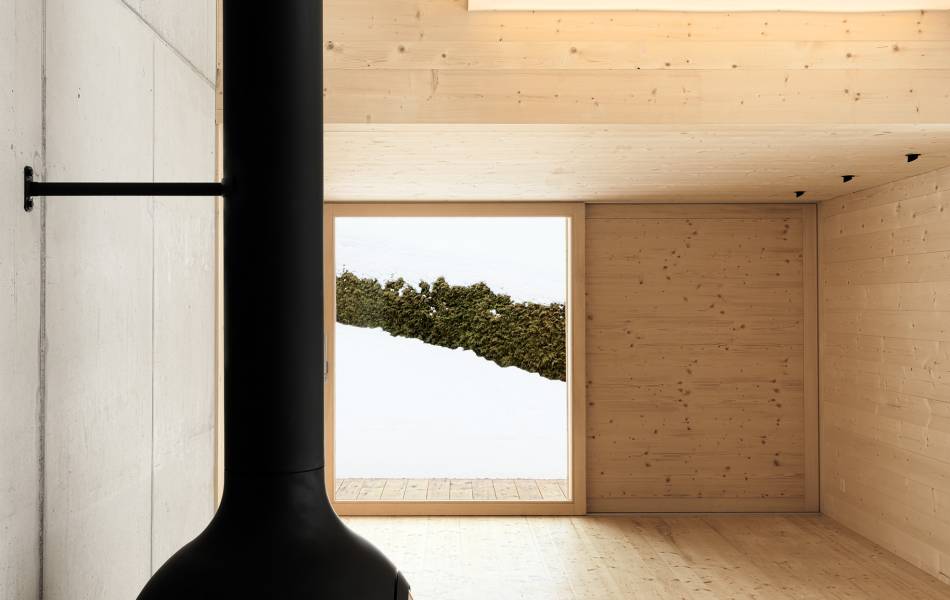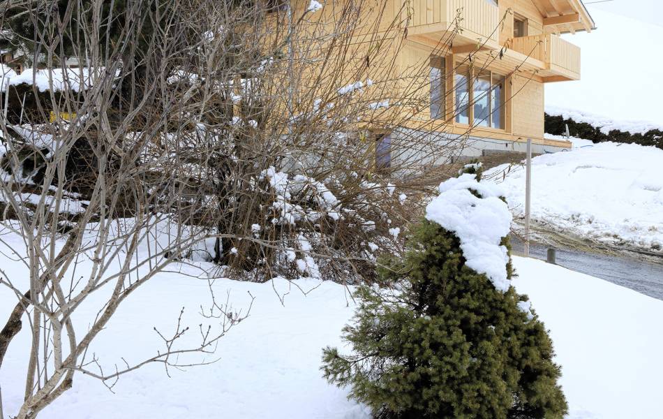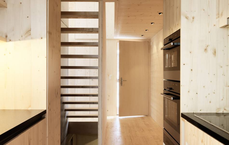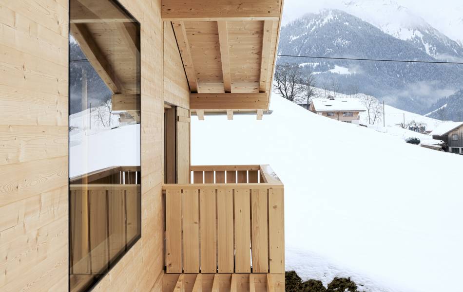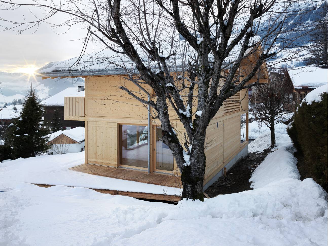Situé dans un quartier résidentiel de Château-d’Oex, le nouveau bâtiment remplace une habitation singulière qui ne répondait plus, tant par sa taille que par son enveloppe, aux standards actuels en matière de logement familial. Sa structure en poteaux-poutres omniprésente fait référence au système constructif des chalets anciens du Pays-d’Enhaut et offre une grande flexibilité quant au traitement des pleins et des vides sur le pourtour du bâtiment. Des éléments de remplissage préfabriqués en atelier viennent s’insérer dans cette structure, comme un jeu, permettant une exécution rapide et économique de l’ouvrage. Le bois de sapin, matériaux indigène dominant, est utilisé de manière unilatérale dans la construction. Il offre une lecture homogène des espaces intérieurs et renforce la clarté de la structure.