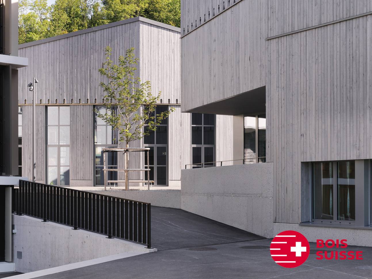 La structure et les façades des deux nouveaux bâtiments privilégient le bois tandis que les toitures sont couvertes d’ardoises fibres-ciment. Les vitrages sont en bois-métal et les protections solaires en toiles. Les dalles de l’école enfantine sont en bois-béton.
