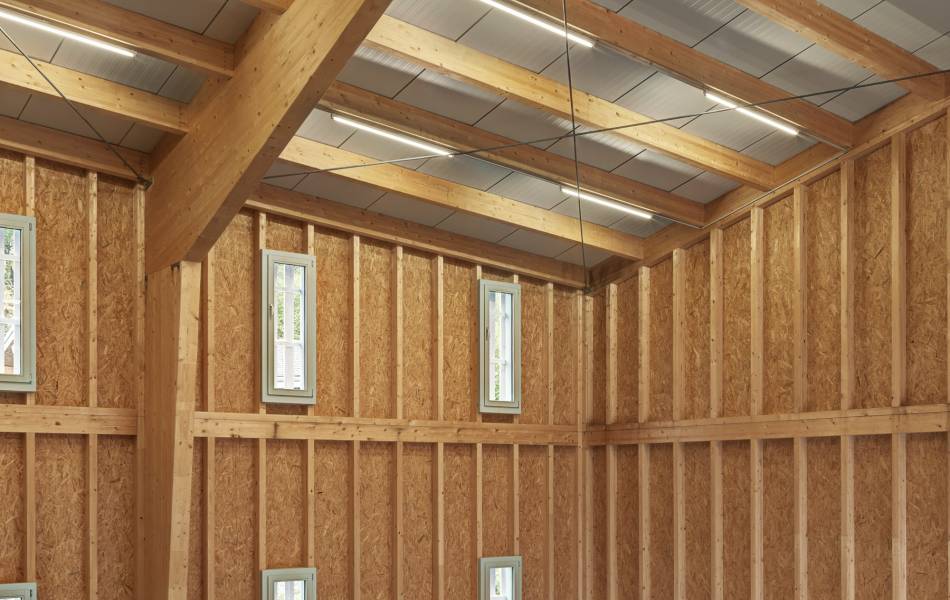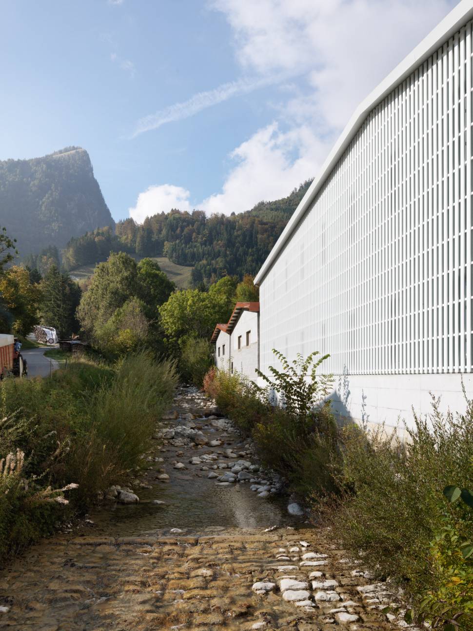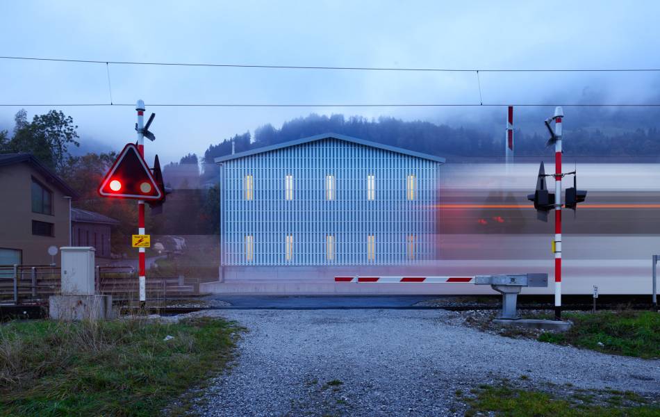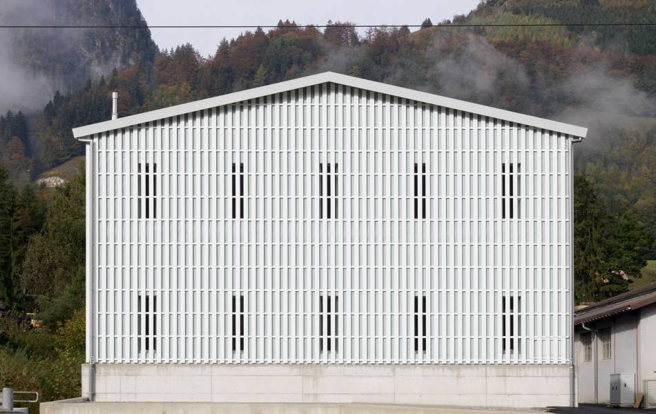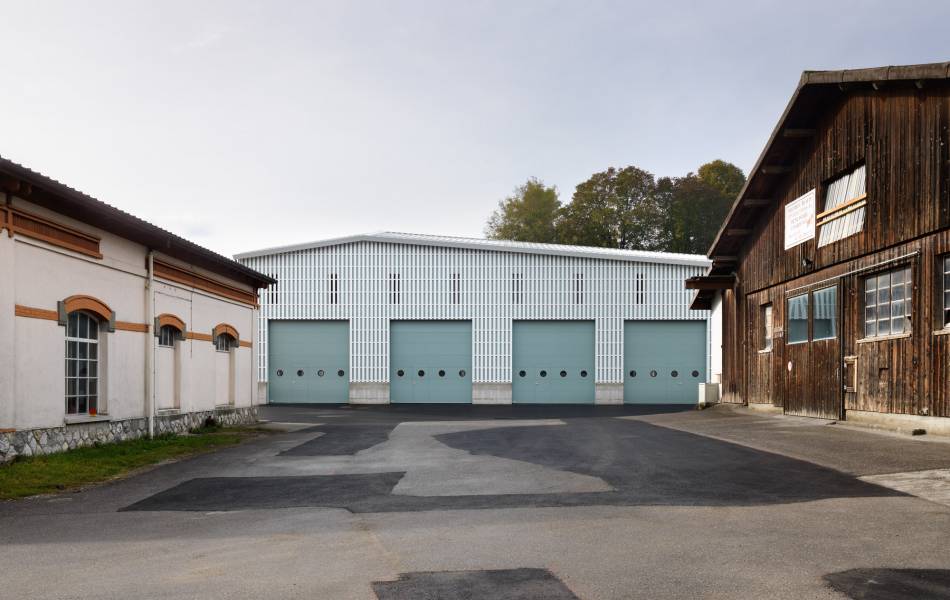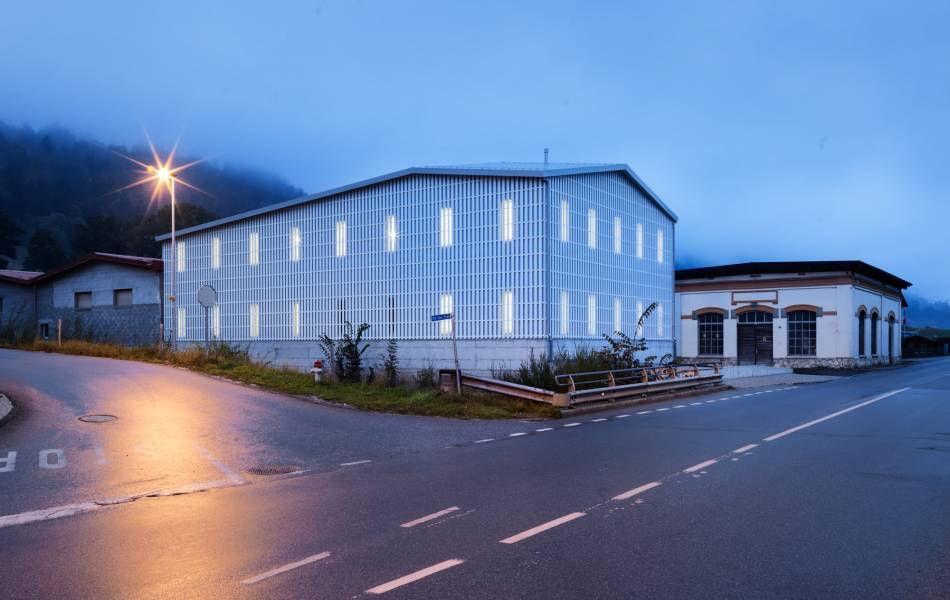 Située à la frontière entre les villages d'Albeuve et de Neirivue, le nouveau bâtiment remplace un ancien dépôt de maçonnerie. Composée de 3 façades pignon, la nouvelle construction cherche à reconnaître son environnement. Un bardage de bois àjouré habille et filtre la façade composée d'une membrane anti-uv de couleur gris-bleu faisant référence à la Marivue, rivière longeant le nouveau dépôt.
