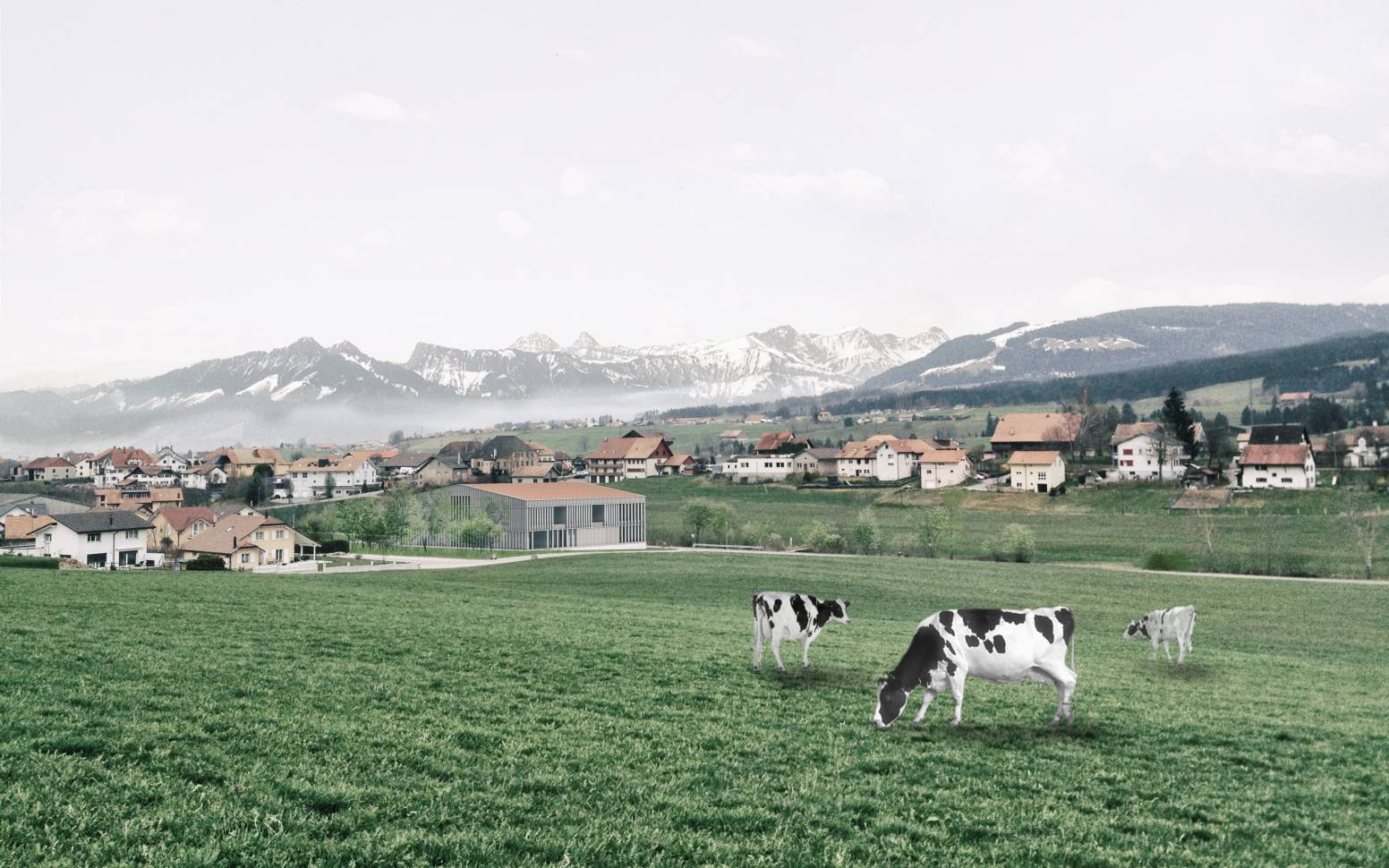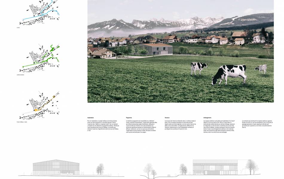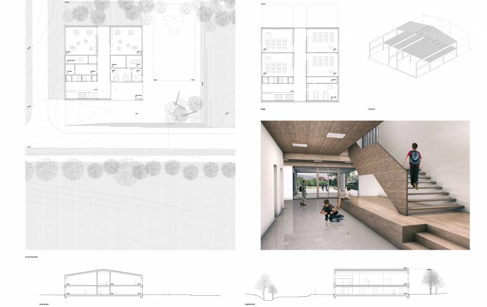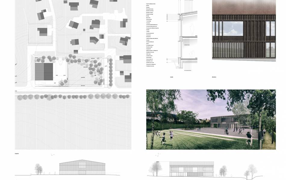 Concours 4ème prix. Par son implantation, le projet renforce une limite existante entre une zone construite et un territoire agricole. Situé à l’ouest du site, il définit un important vide à l’est, ou viennent s’installer tous les éléments du programme extérieur. Reliée par l’axe historique qu’est la rue du Château, la nouvelle cour d’école à l’ouest du village fait ainsi écho à la cour du Château à l’est. La totalité du programme est rassemblée en un bâtiment unique, rationnel et économique. L’organisation générale offre aux salles de classe deux types d’orientation, côté prés à l’ouest et côté cour d’école à l’est.