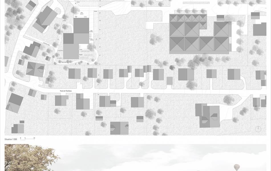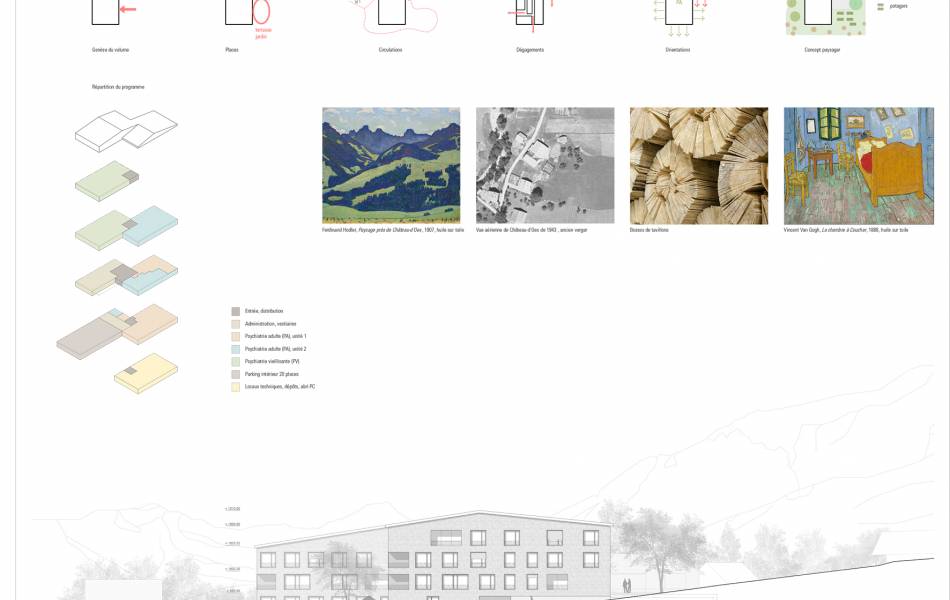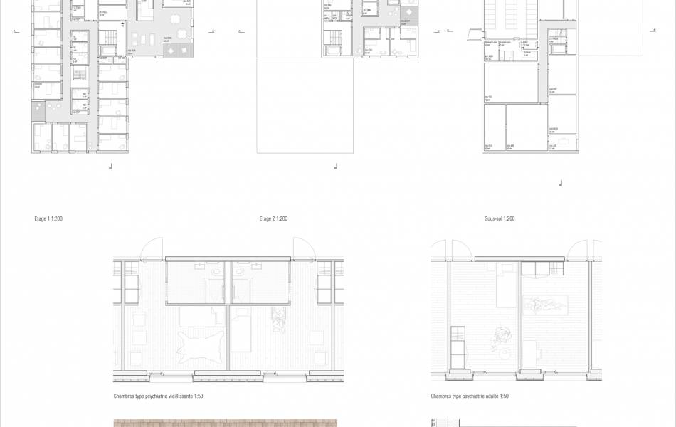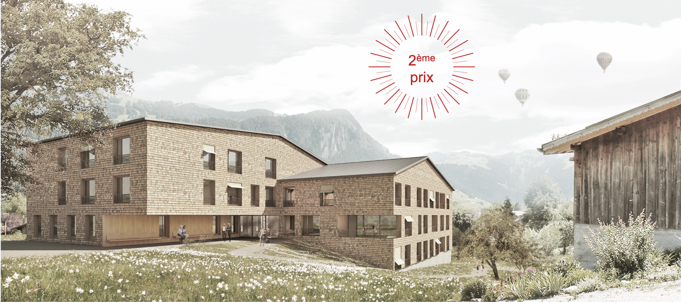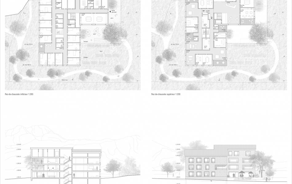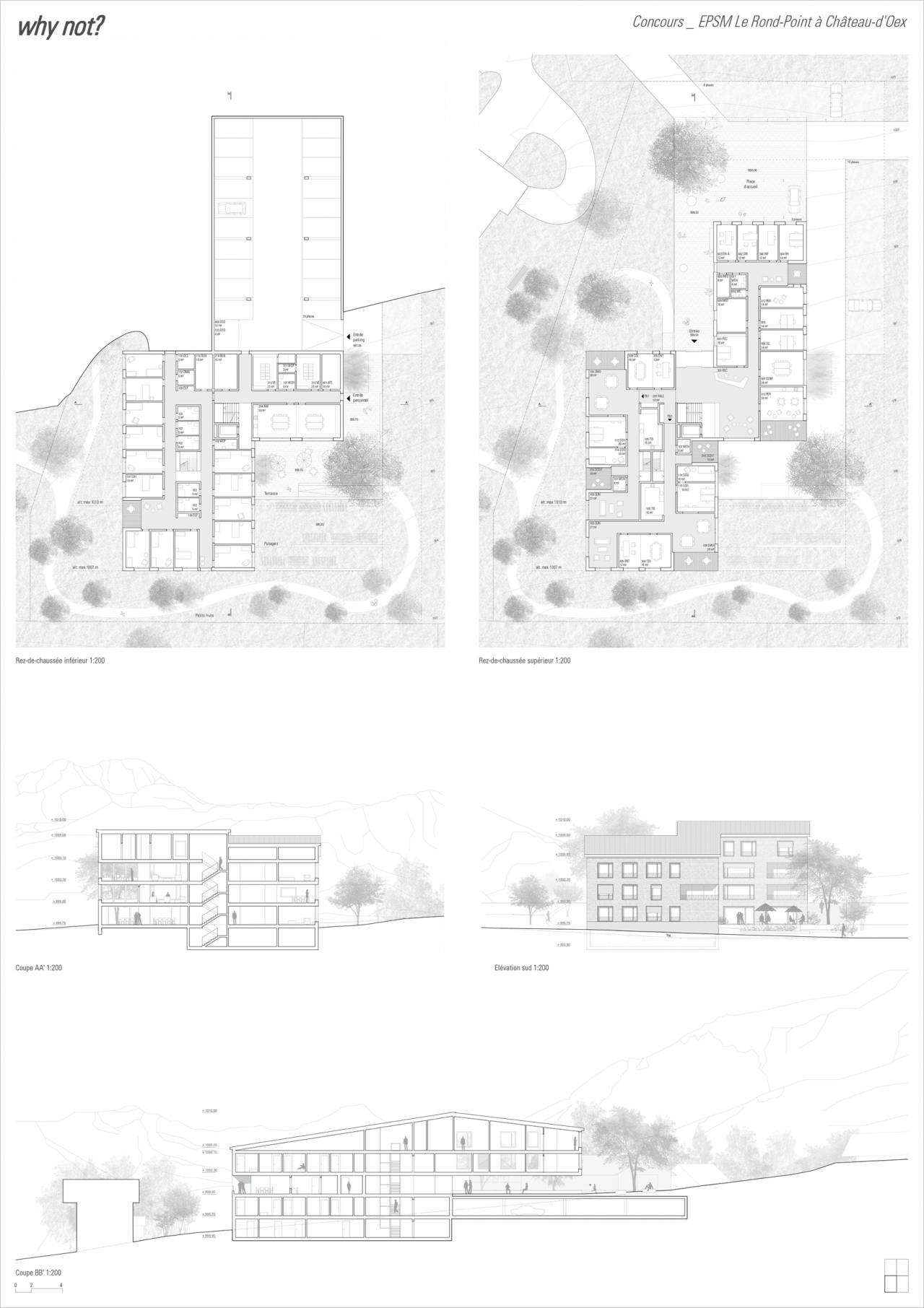 Concours 2ème prix/3ème rang. Le projet propose un bâtiment articulé en Z générant une volumétrie à l’échelle des habitations environnantes. Sa matérialité et son jeu de toitures ambitionnent de renforcer une implantation s’intégrant dans un contexte villageois. Sa géométrie fait valoir une organisation intérieure du bâtiment offrant une quadruple orientation à chaque unité de vie. Tirant parti de la topographie, le projet propose un accès principal à l’EPSM par le nord, au niveau de la future route. Le parking souterrain est accessible un niveau plus bas, en longeant la façade Est du bâtiment. Afin de gérer la pente du terrain, des murs de soutènement sont aménagés au droit de la terrasse et du jardin thérapeutique permettant ainsi d’augmenter les surfaces planes. Des arbres fruitiers indigènes à hautes et petites tiges ainsi que des érables champêtres sont répartis le long du cheminement piétons, créant ainsi des zones d’ombres et de détente.