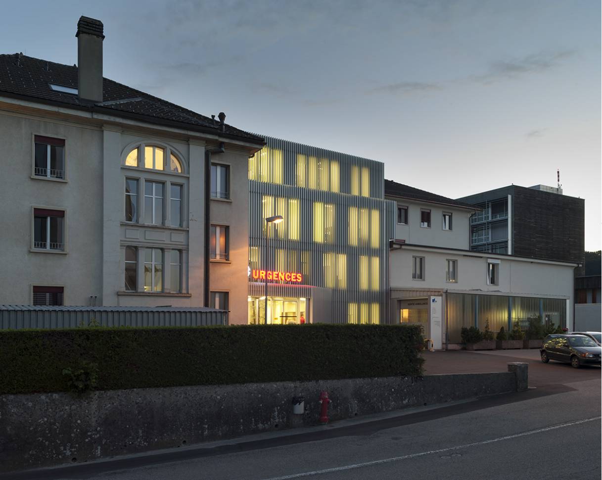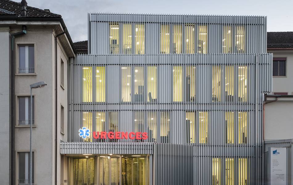 Le projet d’agrandissement des urgences s’inscrit de manière sensible dans le site de l’hôpital de Riaz et plus particulièrement face à l’église protégée par un périmètre de sites construits d’importance nationale ISOS. Pour atténuer la sensation d’un volume trop imposant, le nouveau bâtiment se décompose en 3 volumes, l’entrée, les 3 étages et le dernier niveau décalé sur l’arrière, laissant la place aux toitures des bâtiments existants. Afin de rationaliser au mieux la structure du nouveau bâtiment et de permettre une modularité des espaces, un système de poteaux intérieurs a été imaginé. La façade rideau composée de lames en aluminium ajourées offre une certaine intimité aux différentes pièces du bâtiment en journée tout en conservant la vue sur le paysage depuis l’intérieur. La nuit, la lumière intérieure s’échappe entre les lames et joue le rôle d’une grande veilleuse. La façade agit dès lors comme un signal clair et sécurisant, dévoilant aux visiteurs un message approprié à son rôle : être la façade des urgences. La transformation des bâtiments existants consiste en la redistribution de certaines affectations et la construction d’une nouvelle salle d’observation de 4 box.