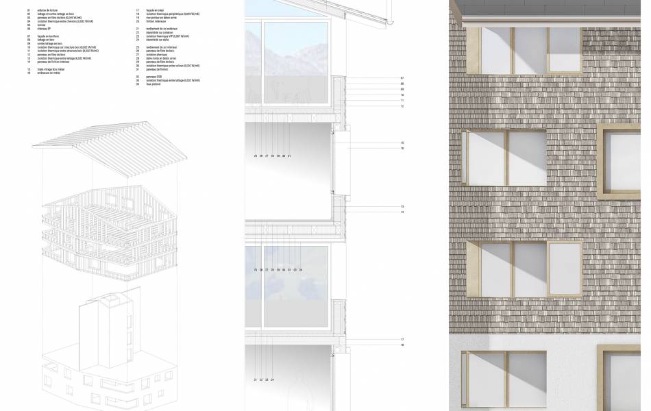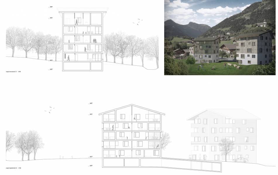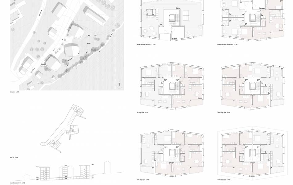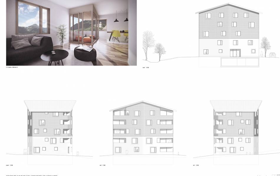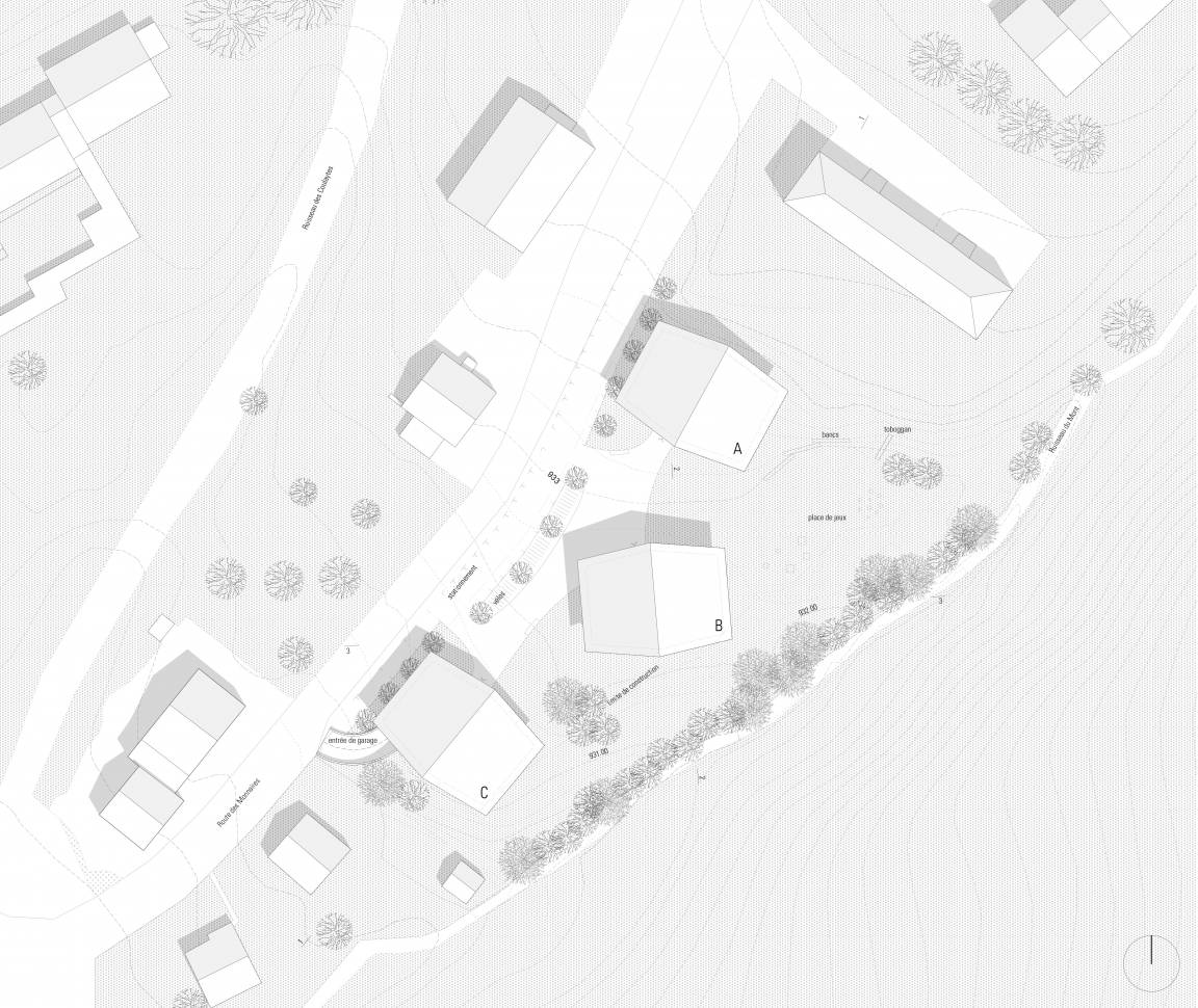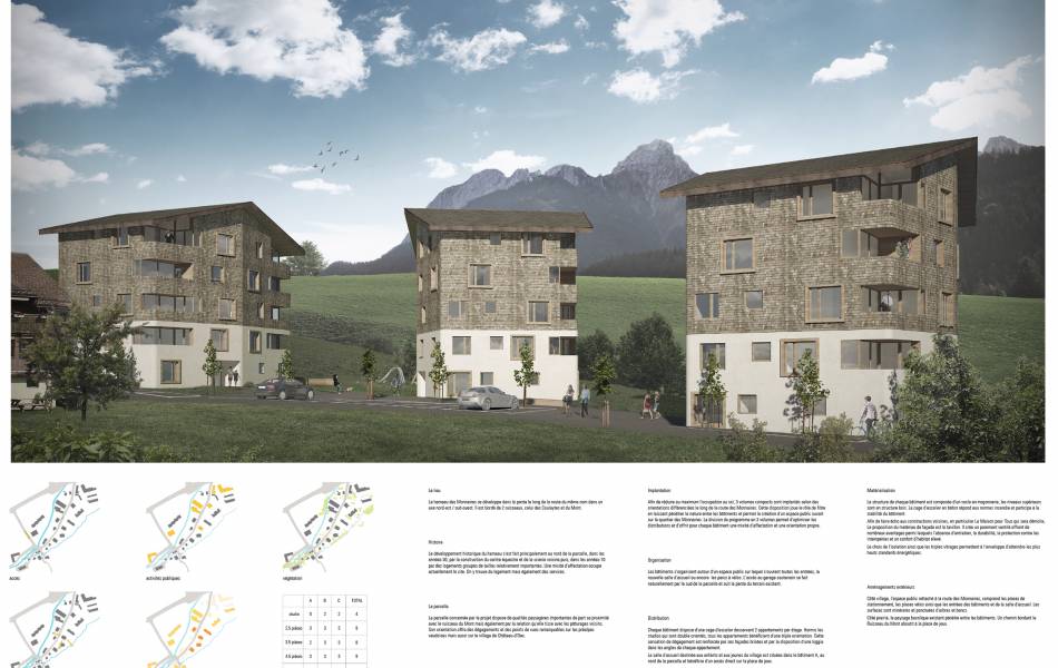 Concours 2ème prix. Afin de réduire au maximum l’occupation au sol, 3 volumes compacts sont implantés selon des orientations différenciées le long de la route des Monnaires. Cette disposition joue le rôle de filtre en laissant pénétrer la nature entre les bâtiments et permet la création d’un espace public ouvert sur le quartier des Monnaires. La division du programme en 3 volumes permet d’optimiser les distributions et d’offrir pour chaque bâtiment une mixité d’affectation et une orientation propre.