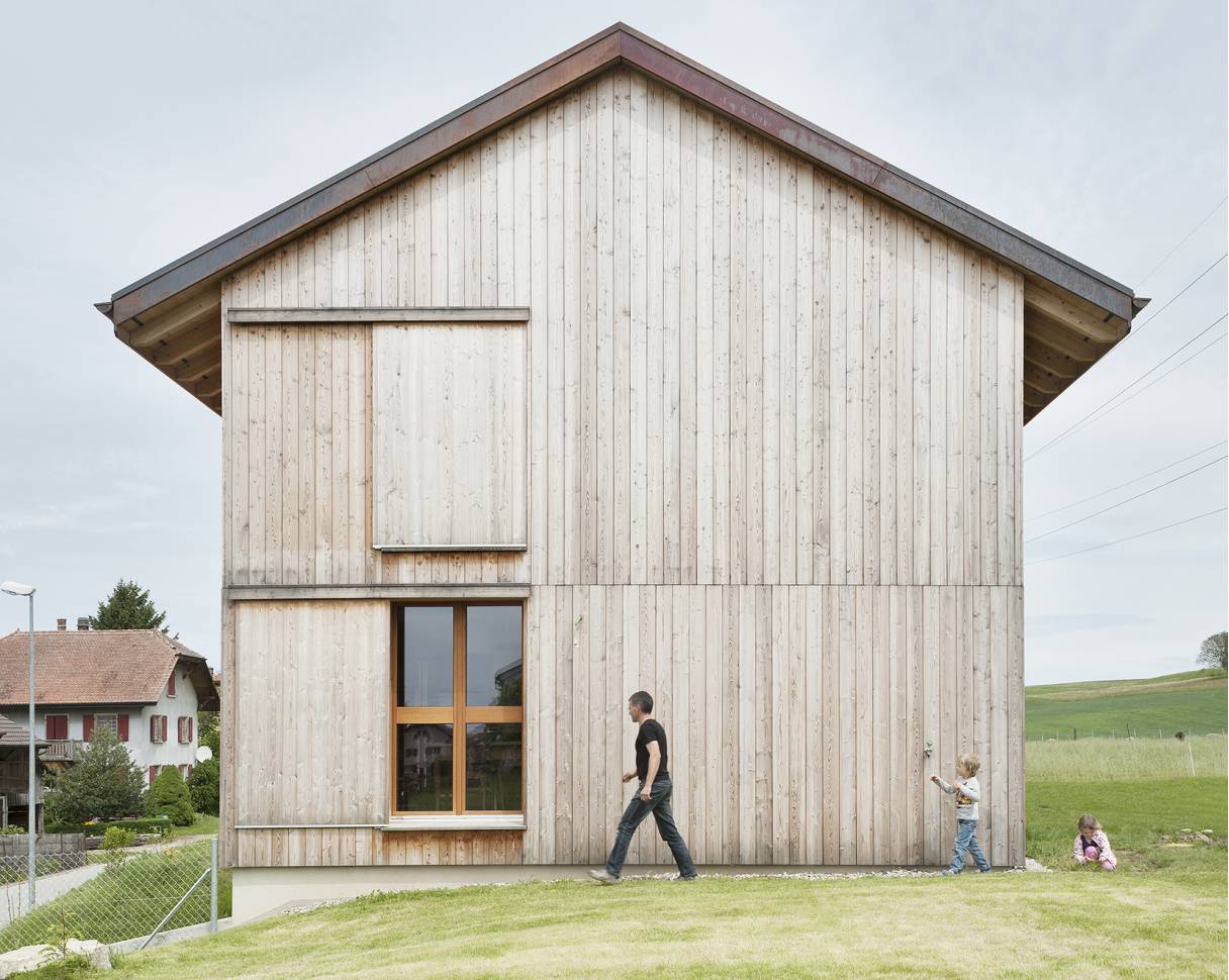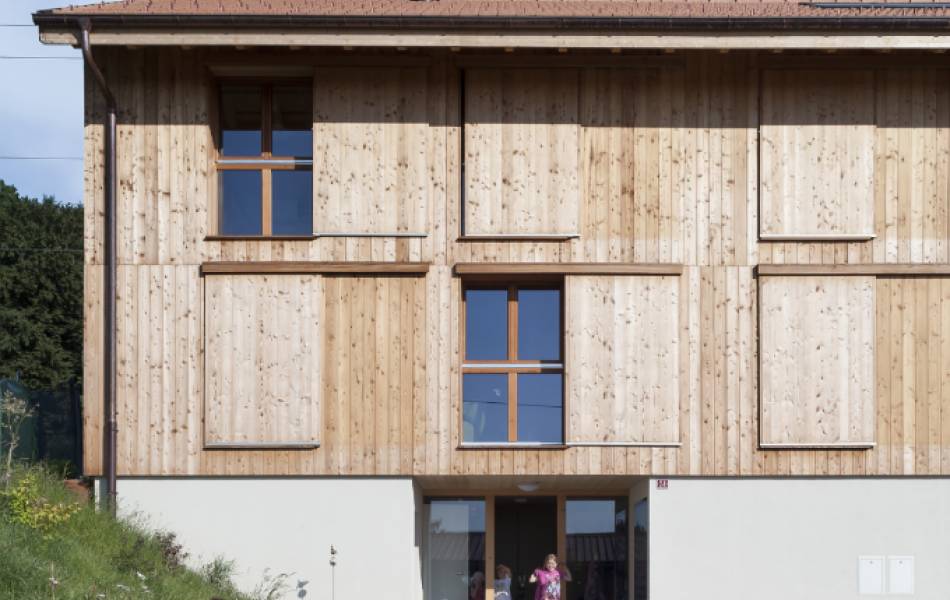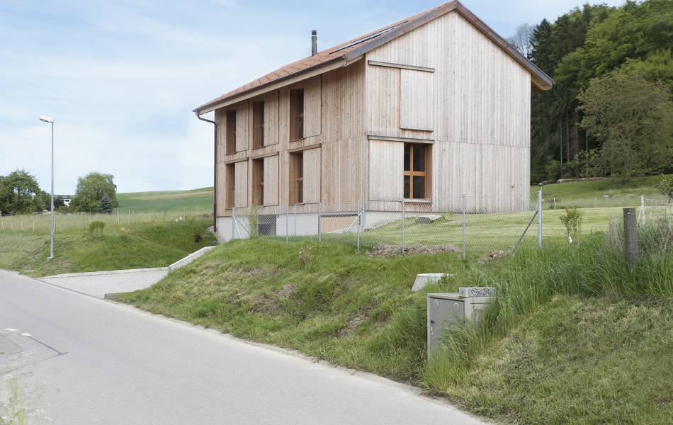 Son implantation s’inscrit dans la continuité du système existant établi essentiellement par les fermes voisines, parallèles à la route. Sa volumétrie se veut simple et régulière, la topographie naturelle du terrain est conservée. Sa matérialité se réfère également aux constructions rurales environnantes.