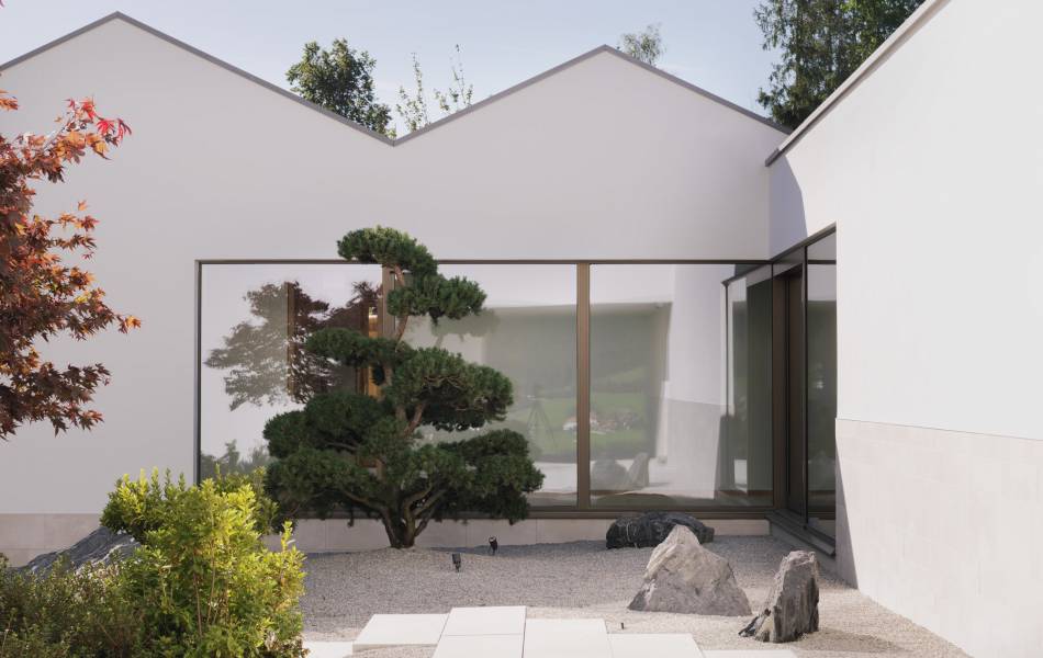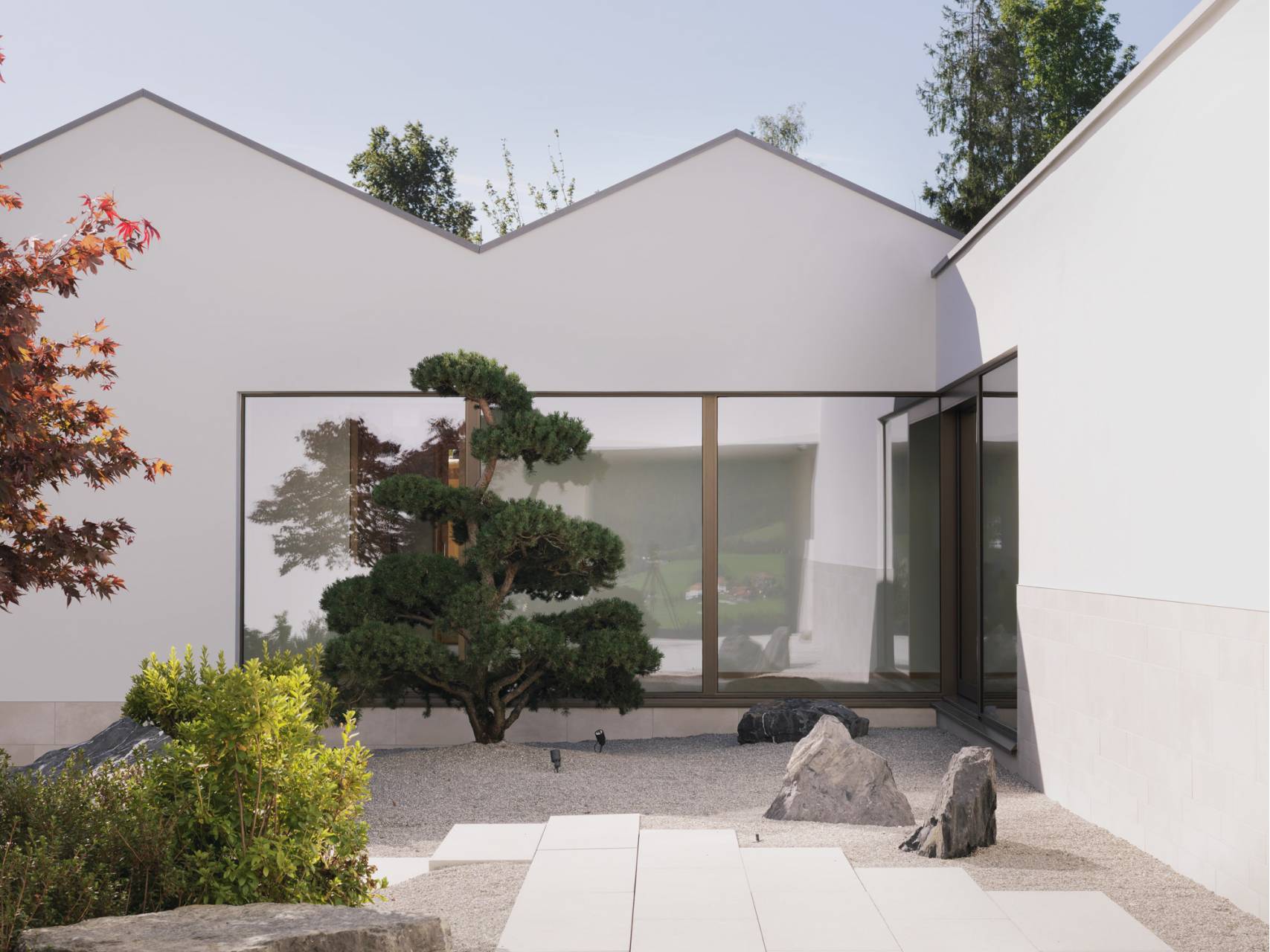 Le projet s’articule autour d’un patio et propose ainsi une dualité des rapports à l’extérieur. La façade extérieure cadre le grand paysage et la vue remarquable sur les Préalpes, c’est la rapport à l’horizon, la relation au monde.