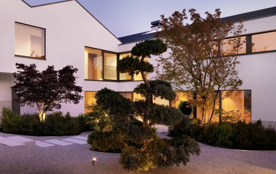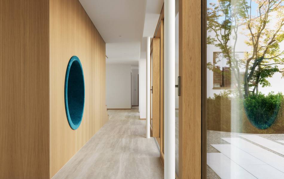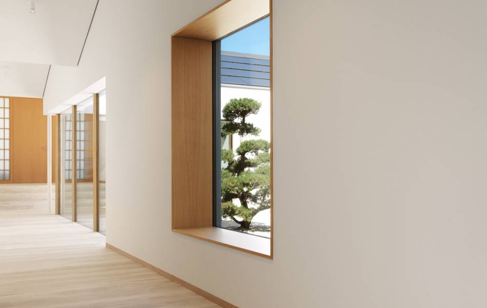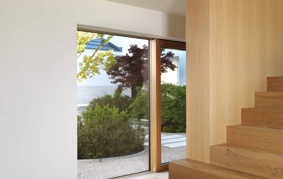 La façade intérieure encadre une mise en scène sur un jardin proche et privé. La relation à l'extérieur est plus intime et étroite, elle invite au calme et au retour sur soi.
