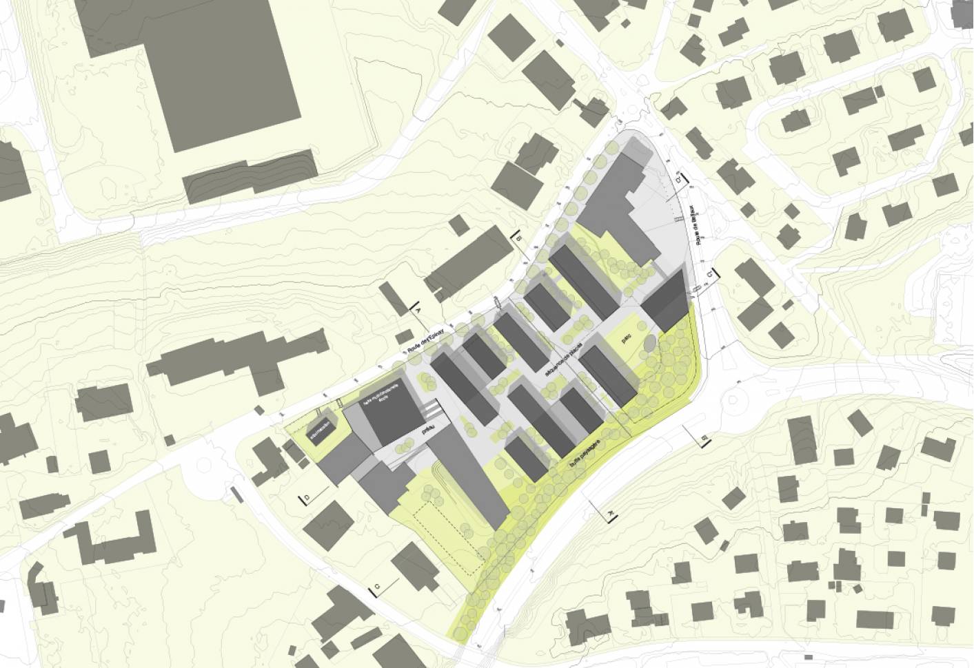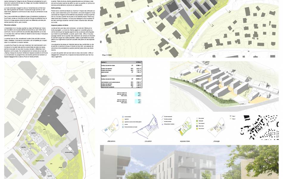 Mandat d'études parralèlles. L’implantation d’un nouveau quartier au coeur de Givisiez est l’occasion de définir une nouvelle identité structurante au sein même de la commune. Tout en confirmant les activités déjà présentes sur le site, un nouveau tissu vient les mettre en relation et de nouveaux marqueurs prennent position. La pointe Nord du site, actuellement vouée à des activités commerciales, hôtelières, d’accueil et d’animation, est complétée par l’implantation d’un bâtiment à vocation tertiaire. La partie Sud-Ouest du site avec l’extension de l’administration communale et la nouvelle halle sportive surplombée de salles de classe, permet d’accueillir, en plus des nouveaux écoliers, différentes manifestations communales. Son emplacement en bordure de la route de L’Epinay marque et structure l’entrée de l’espace scolaire et communal. La concentration du programme à cet endroit permet de maintenir un espace dégagé entre la salle du Rural et l’école primaire. Le coeur du site est dessiné par une série de bandes se déclinant dans la pente. Cette structure urbaine perpendiculaire aux principaux axes de communication permet de définir au sein du quartier un rythme d’alternance entre éléments construits et ruelles jardin.