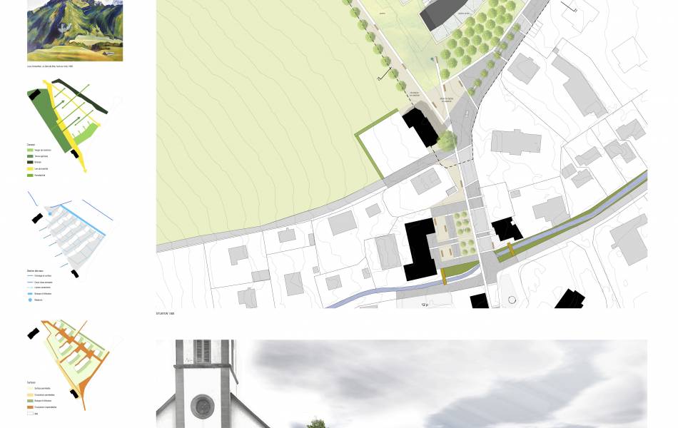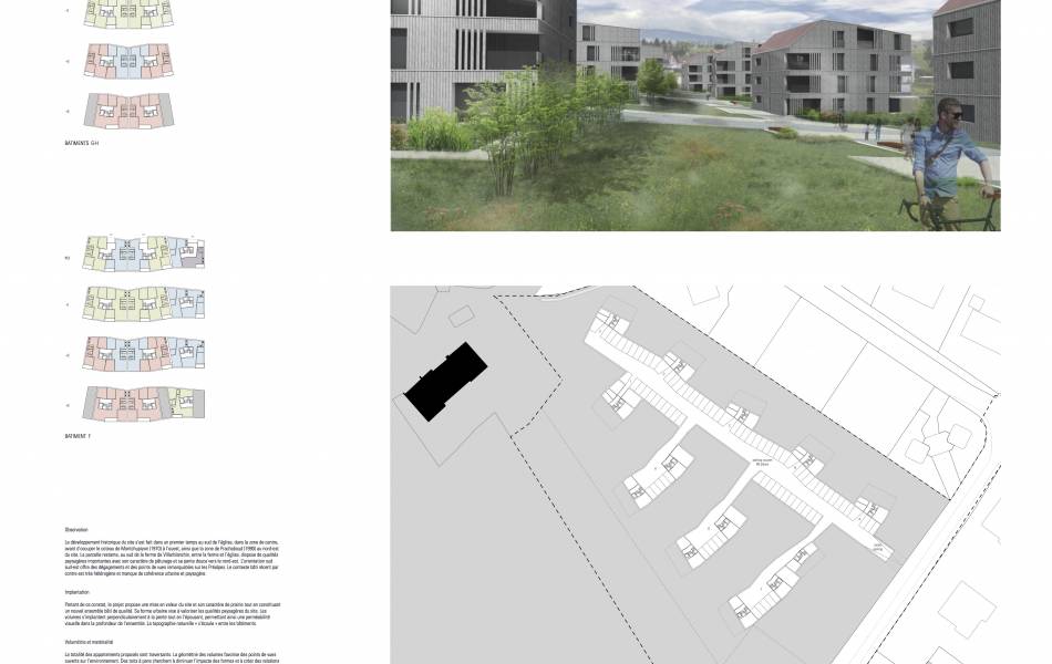 Mandat d'études parallèles. Le projet propose une mise en valeur du site et son caractère de prairie tout en constituant un nouvel ensemble bâti de qualité. Sa forme urbaine vise à valoriser les qualités paysagères du site. Les volumes s’implantent perpendiculairement à la pente tout en l’épousant, permettant ainsi une perméabilité visuelle dans la profondeur de l’ensemble. La topographie naturelle « s’écoule » entre les bâtiments.