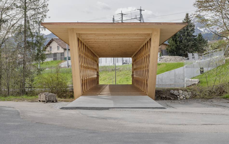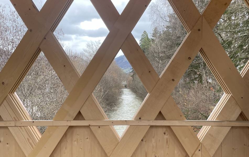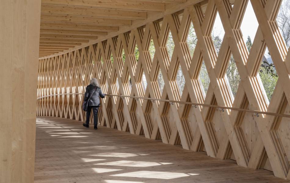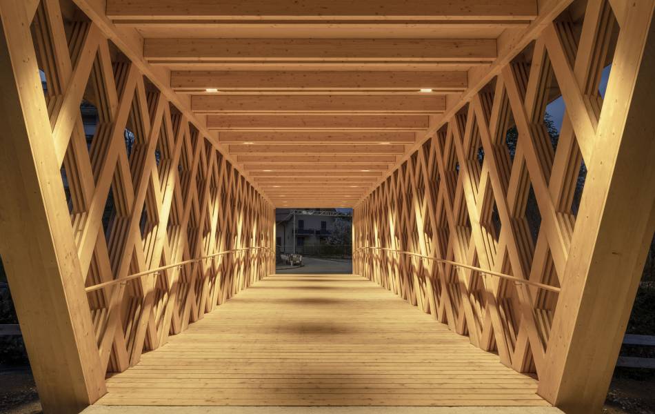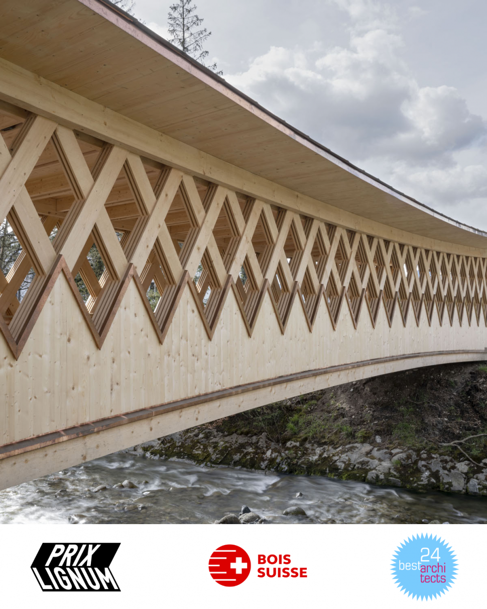 En franchissant la rivière, la passerelle des Buissons propose une nouvelle liaison entre les habitations au sud des berges et le centre ville de Bulle, au nord. Elle complète ainsi le réseau de mobilité douce tout en valorisant les rives de la Trême. Parallélépipède ajouré aux arêtes arquées, sa structure est une réinterprétation contemporaine de la poutre à treillis. Ses diagonales sont constituées de l’entrecroisement de trois à quatre lattes (27/200mm) qui travaillent en traction et en compression. Ce treillis est pincé entre deux membrures dont la courbure en partie basse augmente le tirant d’air face au risque de crues. La protection de l'ouvrage contre les intempéries est assurée par un toit légèrement incliné, complété d'un avant-toit d'une longueur de 1.2 m, couvert d'une ferblanterie en cuivre. La passerelle a été assemblée sur la parcelle voisine et mise en place en une nuit avec une grue de 500 t. L'ouvrage est labellisé Bois Suisse.