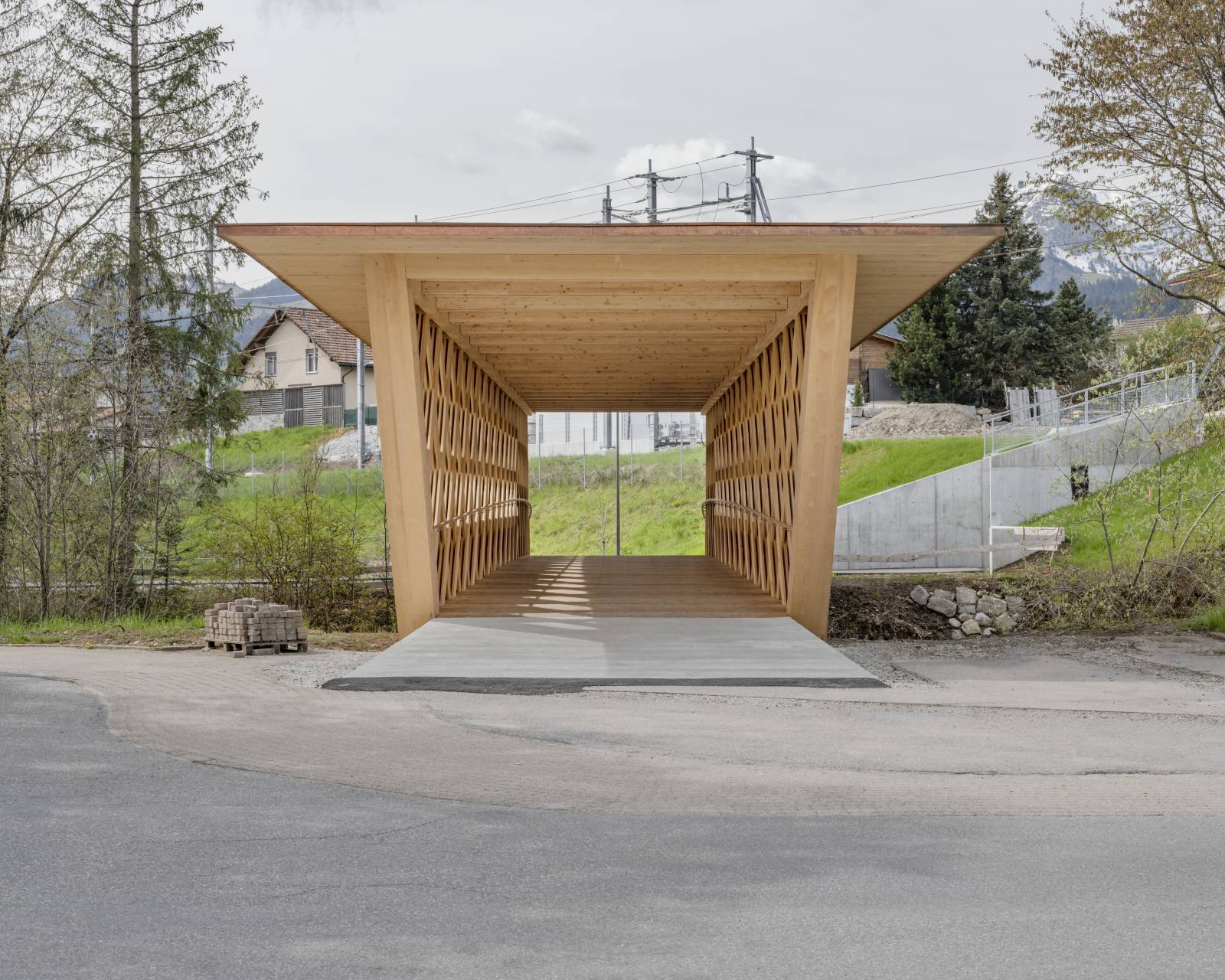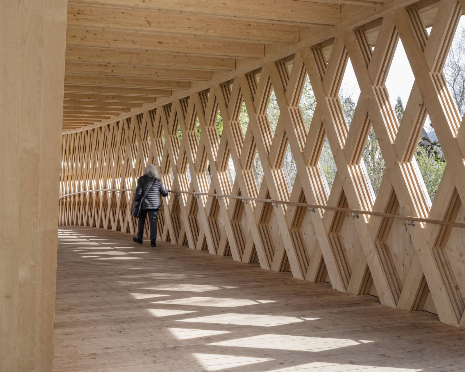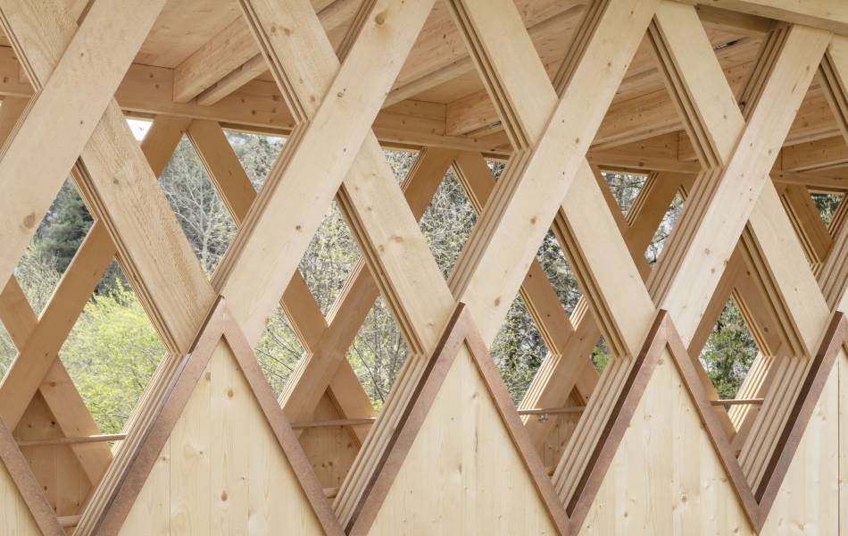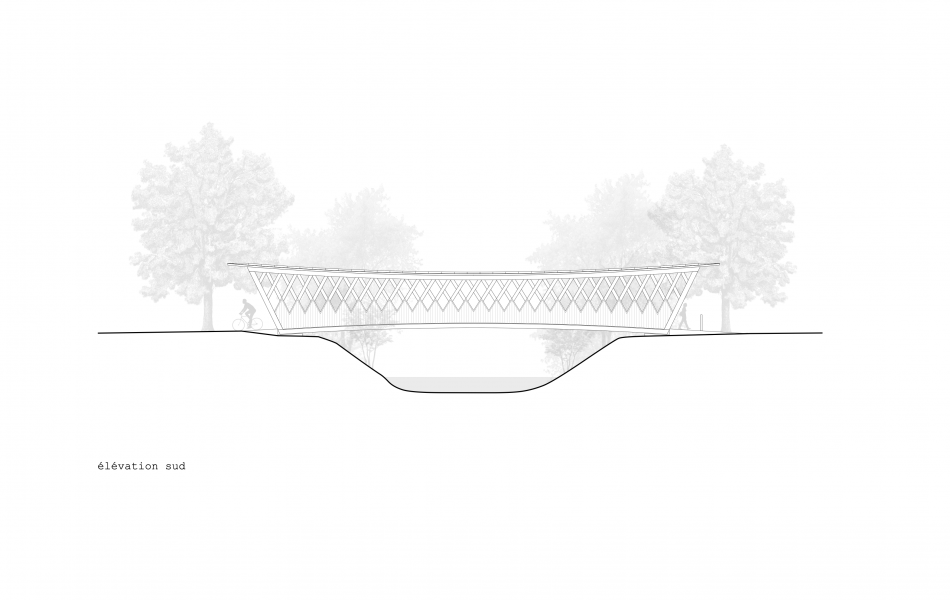 En franchissant la rivière, la passerelle des Buissons propose une nouvelle liaison entre les habitations au sud des berges et le centre ville de Bulle, au nord. Elle complète ainsi le réseau de mobilité douce tout en valorisant les rives de la Trême. Parallélépipède ajouré aux arêtes arquées, sa structure est une réinterprétation contemporaine de la poutre à treillis. Ses diagonales sont constituées de l’entrecroisement de trois à quatre lattes (27/200mm) qui travaillent en traction et en compression. Ce treillis est pincé entre deux membrures dont la courbure en partie basse augmente le tirant d’air face au risque de crues. La protection de l'ouvrage contre les intempéries est assurée par un toit légèrement incliné, complété d'un avant-toit d'une longueur de 1.2 m, couvert d'une ferblanterie en cuivre. La passerelle a été assemblée sur la parcelle voisine et mise en place en une nuit avec une grue de 500 t. L'ouvrage est labellisé Bois Suisse.