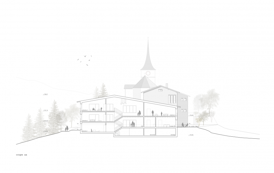 Cette stratégie d’implantation présente plusieurs avantages. Premièrement, le vide entre l’église et l’école est conservé. Cet espace est réaménagé en préau pour les élèves des classes primaires et peut également être maintenu comme espace public ou de stationnement lors de manifestations. Deuxièmement, le choix de l’implantation du nouveau bâtiment au nord permet de diminuer l’impact visuel du projet dans le site. Malgré ses trois niveaux, le nouveau bâtiment reste plus bas, subordonné à l’école existante. D’autre part, et toujours dans le but de réduire la hauteur de l’extension, le projet se développe sur un principe de demi-niveaux en profitant de la topographie existante. Le bâtiment existant conserve son identité et son statut de « bâtiment principal ». Tel qu’il apparaît sur l’huile sur toile de Max Clément (1912-1995) basée sur le projet des architectes Dubey & Surchat, le dialogue qui existe entre l’école de 1963 et l’église est préservé. La nouvelle école se compose ainsi de deux bâtiments, implantés côte à côte, avec deux identités et deux volumétries claires. Deux bons amis, prêts à s’engager sur le chemin de la vie avec confiance et enthousiasme.