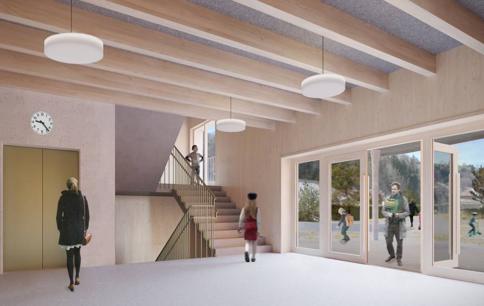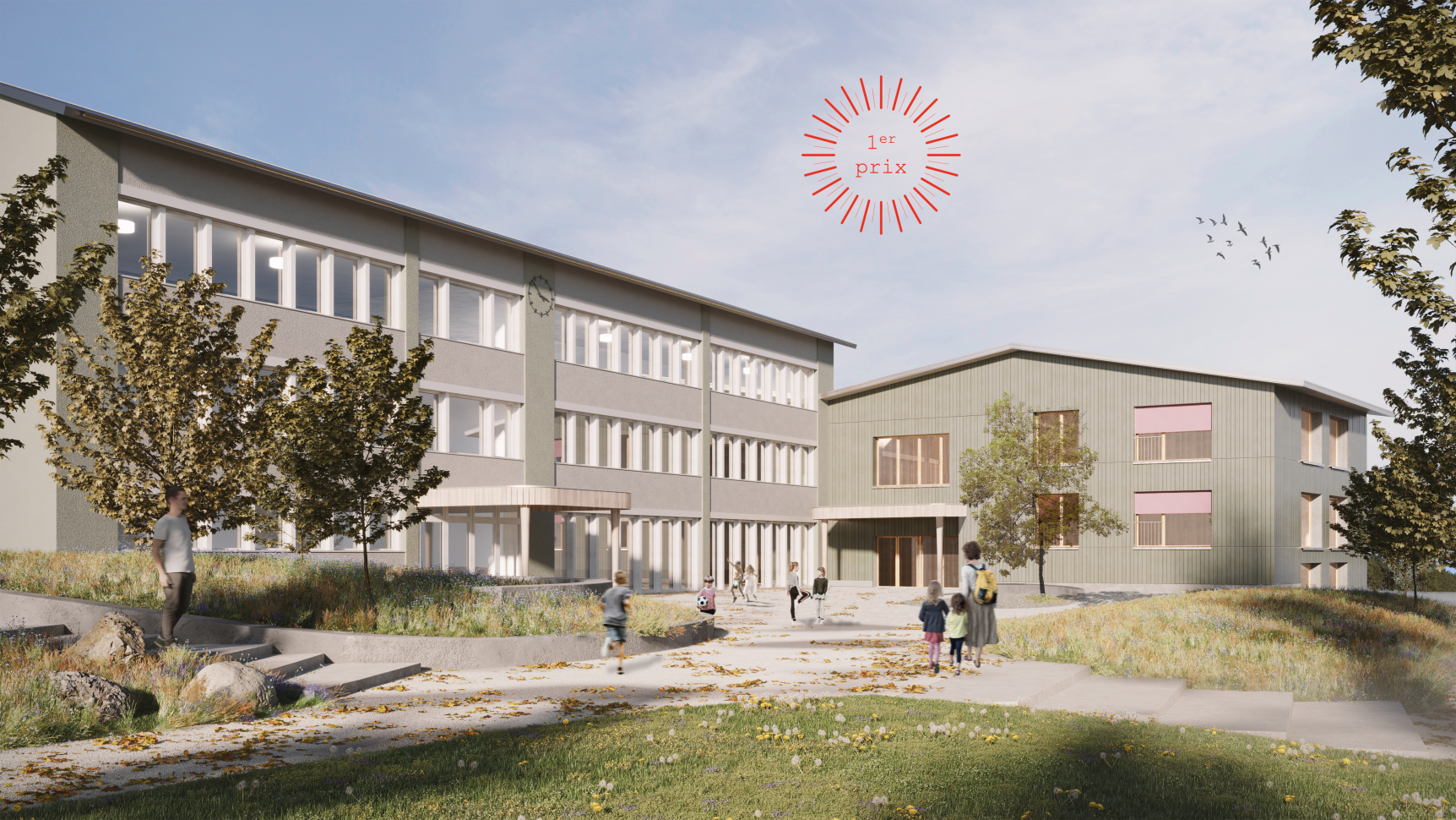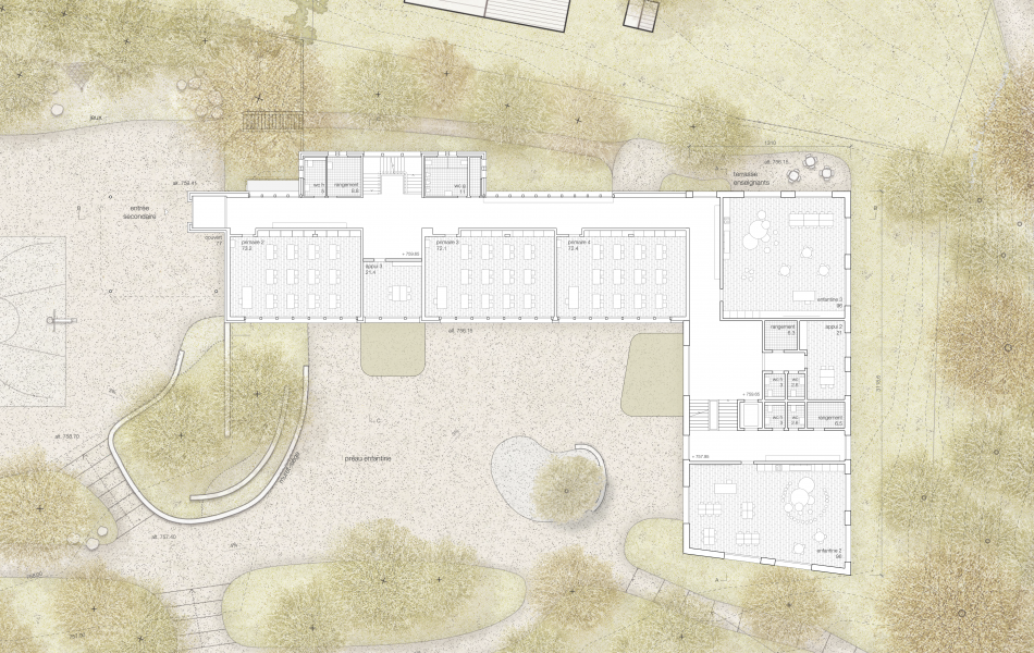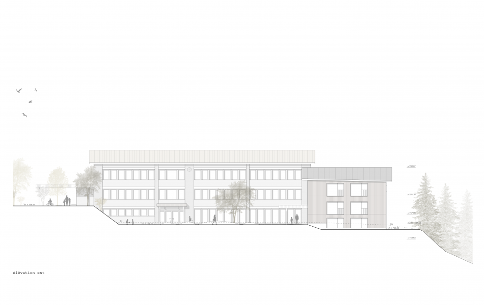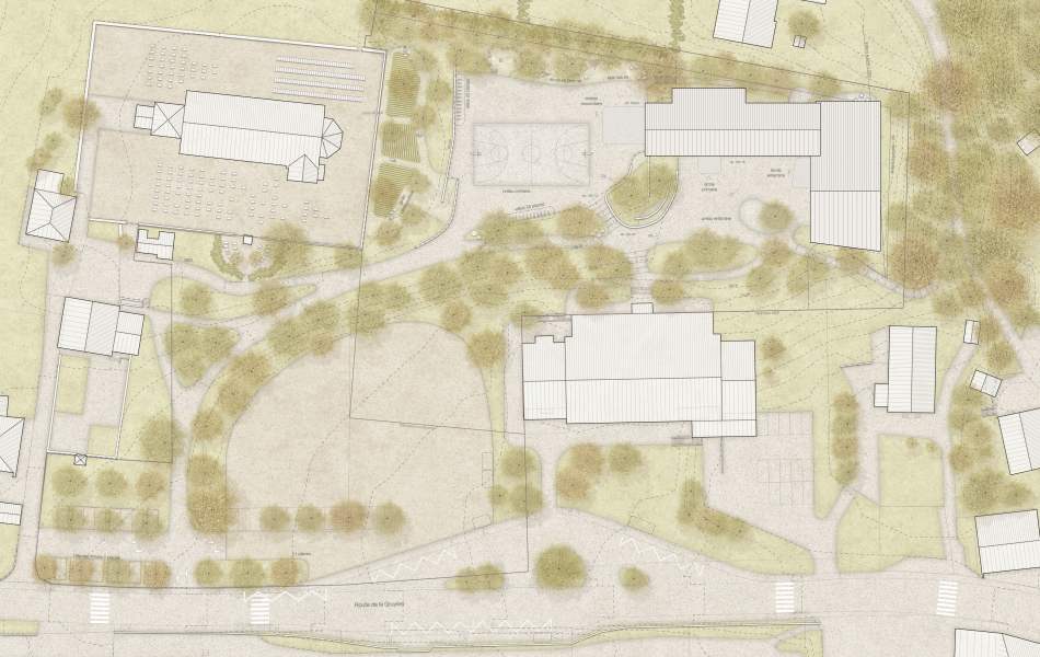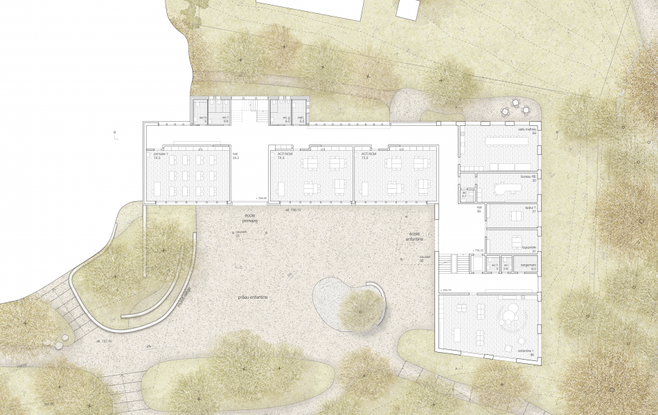 Avec un nouveau bâtiment annexe implanté au nord, le projet propose de laisser libres les places et les espaces existants environnant l’église. Le bâtiment scolaire actuel, inauguré en 1963, est quant à lui appréhendé avec précaution. L’essentiel des éléments qui le composent sont conservés et assainis. Les espaces intérieurs accueillent une transformation douce et ciblée, principalement au rez-inférieur. L’implantation du nouveau volume, accolé au pignon nord du bâtiment existant, répond à trois objectifs principaux : la fonctionnalité globale de la nouvelle école, la minimisation de l’impact d’un nouveau bâtiment sur le site et enfin la souplesse d’usage, rendant également plus facile le phasage des travaux.