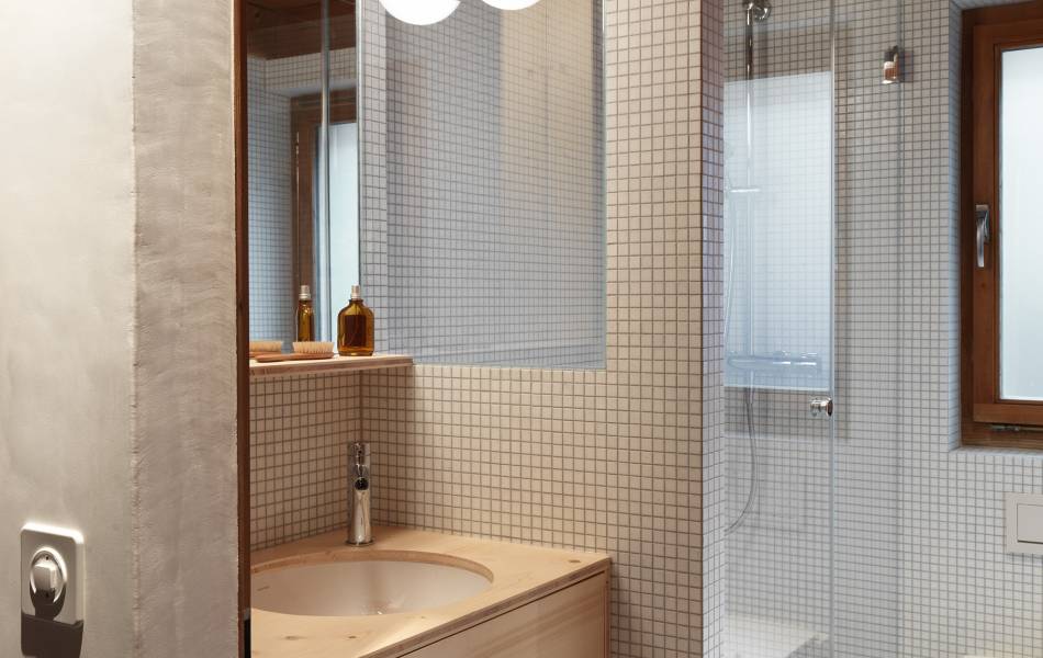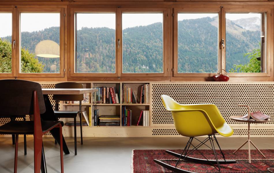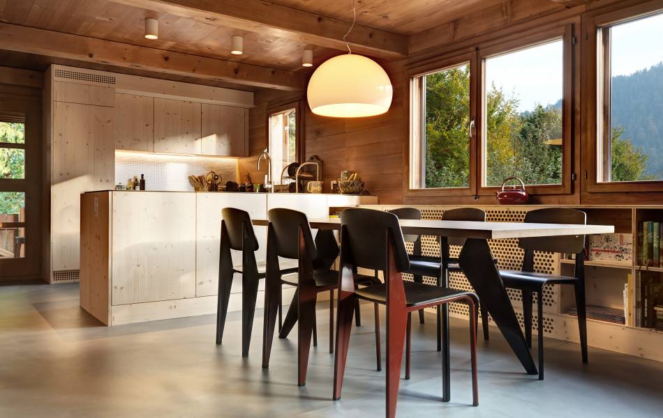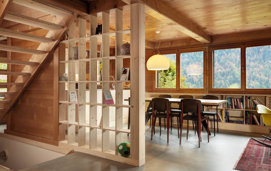 Construit à Rossinière dans les années 80 selon le système de construction poteaux-poutres, le chalet familial à fait l'objet d'une cure de jouvence. Chaques parties transformées à l'image des menuiseries, armoires, cuisine, etc...ont été réalisée en panneaux 3 plis dans le but de différencier le nouveau de l'existant.